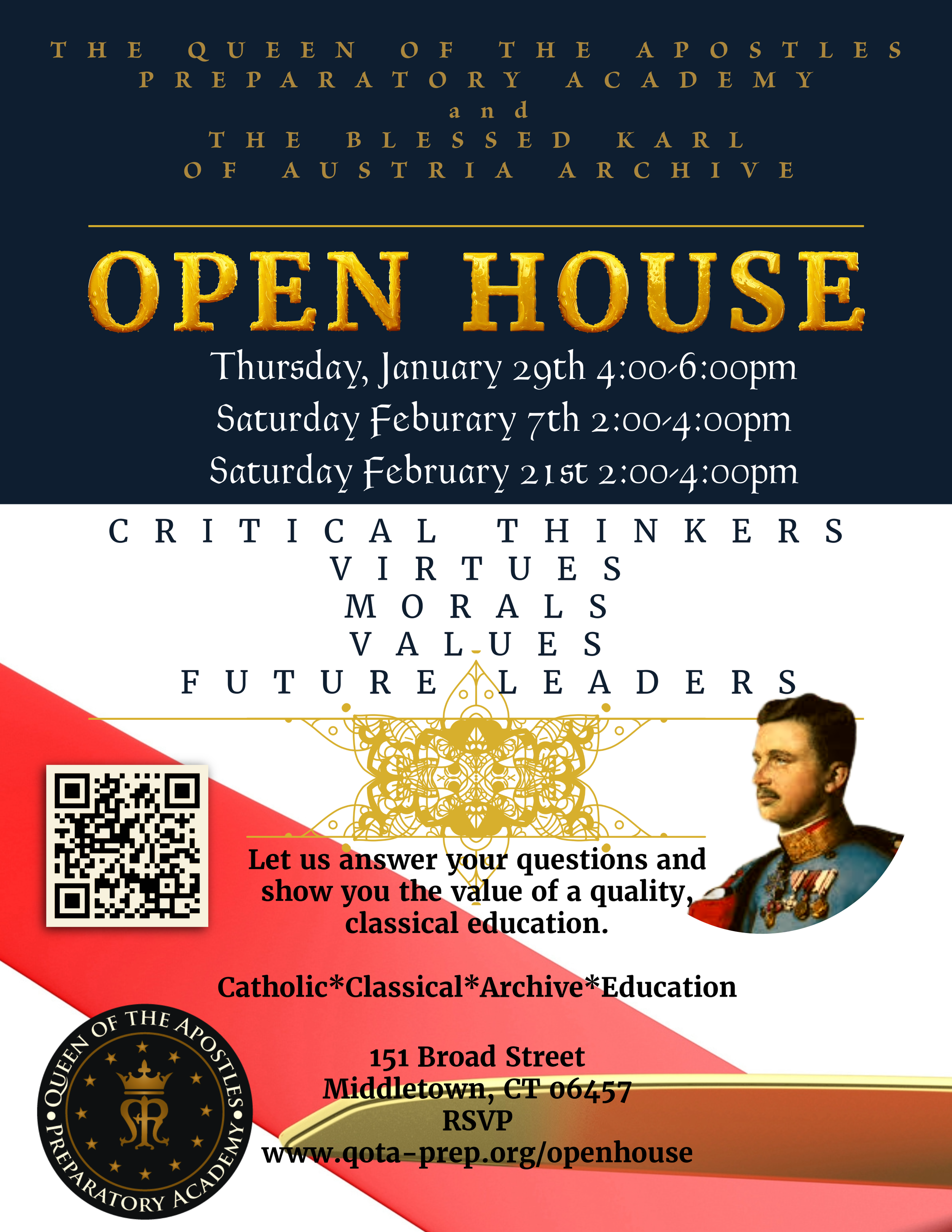 Blessed Karl of Austria (1887-1922) is an example of Christian virtue for our time. Blessed Karl served as Emperor of Austria during World War I. More than anything else, he was a peacemaker, and resolved to carry out that Gospel mandate. As a ruler, he was guided by Catholic social teaching, and understood that Christian virtues must be brought into secular society where they are needed most. As a husband and father, he brought Christ into his marriage and into his home in a profound way. Because of his exemplary love for the Eucharist he has been called the “Eucharistic Emperor.” In all he did, he attempted to treat each person justly, while devoting his whole being to the service of God and humanity. Blessed Karl lived Christian virtue to a heroic degree, out in the world, as most of us must do. His example is an example for those of us who live in the modern world, and preparation to live in that world guided by Christian virtue is the ultimate purpose of education.